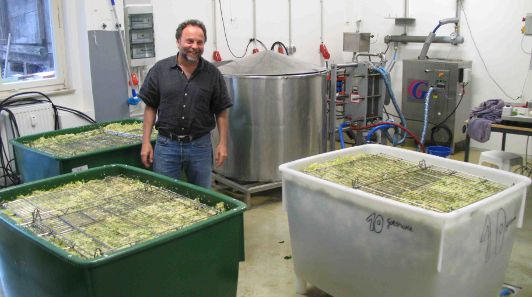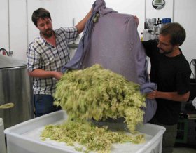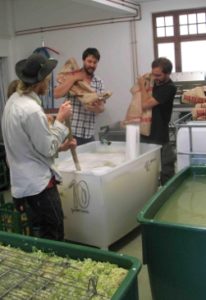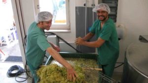 Nachdem das Ganze über Nacht stehen gelassen wurde, werden die Blüten am nächsten Tag wieder herausgeholt – und um auch ja keinen Tropfen zu verschwenden werden sie noch ordentlich ausgepresst. Übrigens, in der Wanne, die ihr hier seht, befinden sich 500 Liter Holunderblüten-auszug – das reicht für acht Paletten Frohlunder, oder 320 Kästen, oder 7680 Flaschen.