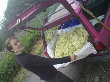 Da die Holunderblüten als Zutat im Vergleich jedoch nur einen sehr kleinen Anteil am Gesamtgewicht des fertigen Produkts ausmachen, hat deren Transport von Kassel nach Tübingen auch nur einen relativ kleinen Einfluss auf die gesamte CO2-Bilanz. Nach ein bisschen Rechnen sind wir der Meinung, dass die Blüten aus Kassel, inklusive deren Transport nach Tübingen, weniger Treibstoff verbrauchen als die, die wir in und um Tübingen wild sammeln würden. Dies ist hauptsächlich dadurch bedingt, dass für die Wildsammlung häufig PKWs eingesetzt werden.